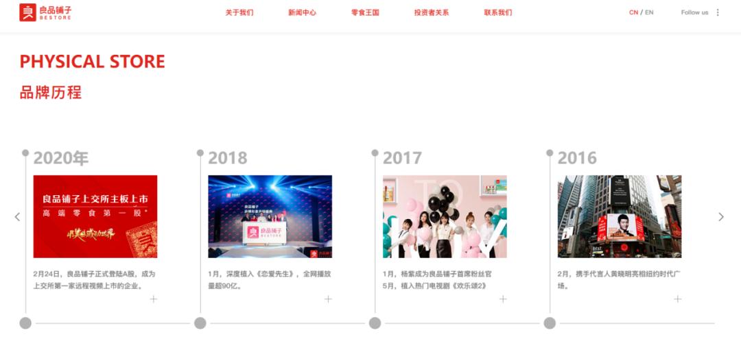 官网的品牌历程专区里,良品铺子更是直接把营销成绩作为重点宣传,包括代言人、影视剧集植入等。细心的朋友可能会发现品牌历程里唯独缺了2019年,那是因为当年良品铺子重金签约吴某凡代言支撑品牌高端定位,不承想该艺人日后却彻底翻车。