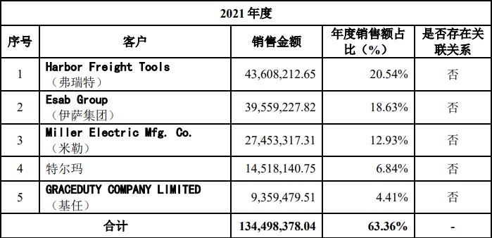 公司客户方面,根据招股书显示,2021年公司前五大客户分别是Harbor Freight Tools、Esab Group、Miller Electric Mfg. Co.、特尔玛、GRACEDUTY COMPANY LIMITED。