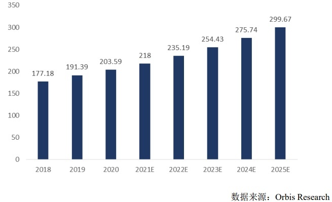 近年来,随着工业领域的工作环境中的空气污染物愈发复杂,呼吸防护产品逐渐成为相关从业人员的刚性需求。目前中国电动送风过滤式呼吸器行业处于初期发 展阶段,根据Orbis Research 数据显示,2020年中国电动送风过滤式呼吸器的市场规模达到203.59 百万美元,预计至2025年将达到299.67百万美元,复合增长率为 8.04%。