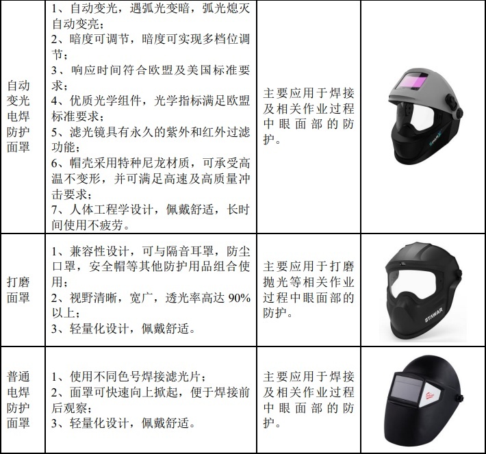 电焊防护面罩系列产品示意图