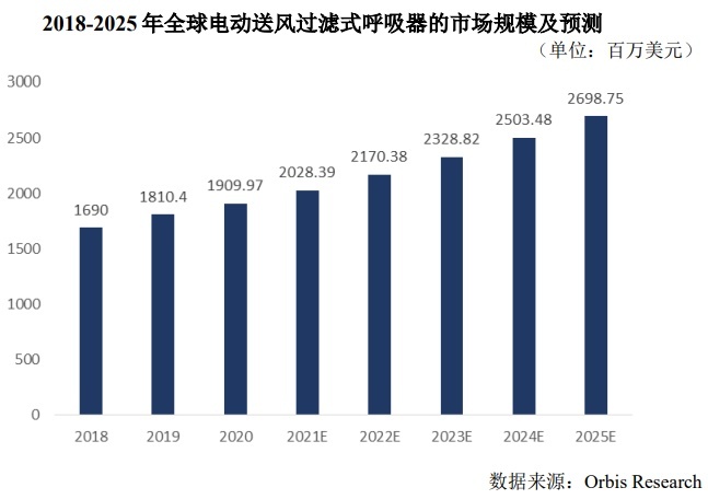 电动送风过滤式呼吸器产品可以为佩戴者提供呼吸防护,有效避免有害气体、化学物质、烟雾、粉尘颗粒等危害因素对人体的伤害,可在大多数环境空气存在危险因素且不缺氧的环境中发挥对人体的呼吸保护作用,应用领域较为广泛。从市场规模及增长趋势来看,根据Orbis Research 数据显示,2020年全球电动送风过滤式呼吸器的市场规模达1909.97百万美元,预计到2025年增至2698.75百万美元。