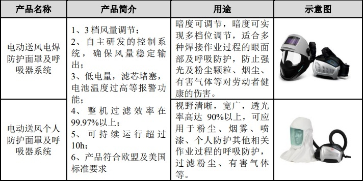除了电焊防护面罩业务,公司的另一大营收业务是电动送风过滤式呼吸器。根据招股书显示,电动送风过滤式呼吸器是一种通过电动过滤器将过滤后的空气加压输送至穿戴者的面罩、头罩、防护服等封闭呼吸区的劳动防护用品。目前,该产品广泛用于化工、医疗、机械制造等领域。