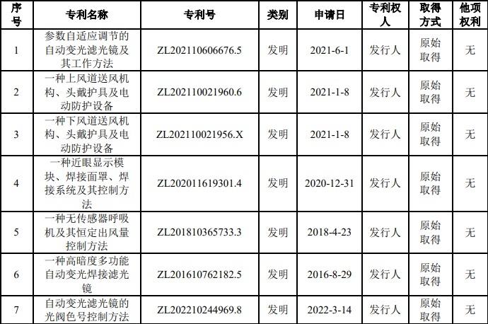 迅安科技在招股书中表示,目前公司已经掌握了恒风量控制、参数自适应调节的自动变光滤光镜及其工作方法、基于温度补偿技术的自动调节色号变光滤光镜等关键性核心技术。截至2022年9月底,公司共拥有授权专利47项,其中发明专利7项、实用新型专利25项。