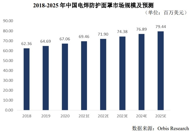 根据Orbis Research数据显示,2020年全球电焊防护面罩市场规模约达到7.37亿美元,预计到2025年市场规模将增长至约8.31亿美元。电焊防护面罩市场中主要包括普通电焊防护面罩和自动变光电焊防护面罩产品,目前市场占比分别约为57%和43%,随着自动变光电焊防护面罩的市场接受度不断提高,需求进一步释放,市场规模将会持续增长。