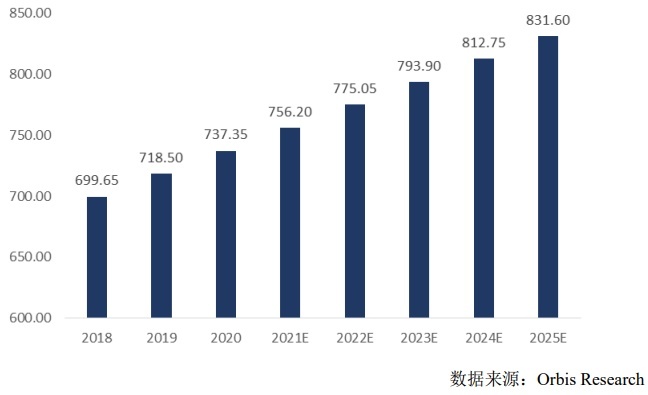2018-2025 年全球电焊防护面罩市场规模及预测(单位:百万美元)
