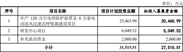 IPO募资方面,根据招股书显示,本次公司拟募资2.75亿元,资金将用于年产120万只电焊防护面罩及8万套电动送风过滤式呼吸器建设项目、研发中心项目等。本项目建设完成后,公司自动变光电焊防护面罩、电动送风过滤式呼吸器生产能力将得到有效提升,有利于公司加速市场布局,巩固和完善公司的行业地位。