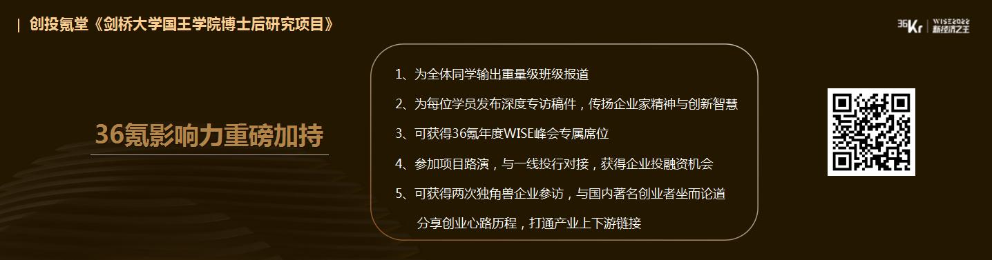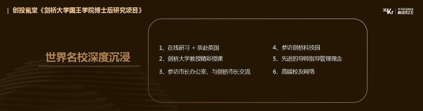 第二个产品,是我们刚刚推出的,与剑桥大学国王学院强强联合共同合作的博士后研究项目。剑桥大学大家都知道,是世界上最顶级的学府。建校以来,一共有120余位诺奖得主,同时也诞生了无数政要、商界传奇。像国内我们大家都很熟悉的徐志摩、乒乓女王邓亚萍等一大批名人和企业家,都毕业于剑桥大学。36氪是我们国内的新经济第一媒体,此次剑桥和36氪强强联合,也是今年剑桥大学国王学院面向亚洲首次开放,将于2023年1月开学,这个机会还是非常难得的,项目含金量也极高。