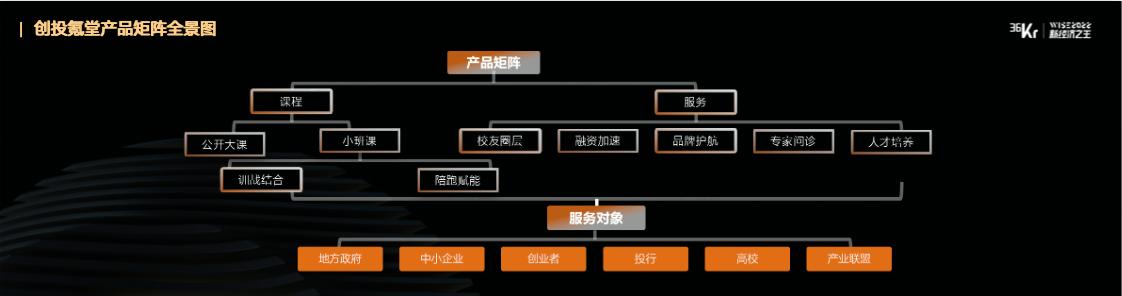 前端就是我们以课程为抓手,通过线上线下的课程,包括线下的一些公开大课和小班课,通过信战结合的教育方式,为企业和创业者提供赋能和陪跑的服务。服务端,我们会设置一系列线下的服务活动。比如我们会搭建自己的36氪创投氪堂校友会,链接学员之间的上下游产业,打通学员之间的圈层。同时,我们也会提供一系列融资对接服务。比如我们会做相应的企业PR、企业报道,为我们整个36氪做相应的企业端升级和赋能。通过线下的专家问诊、人才培养等等,去服务到地方政府、产业、中小企业,甚至延伸到地方高校。