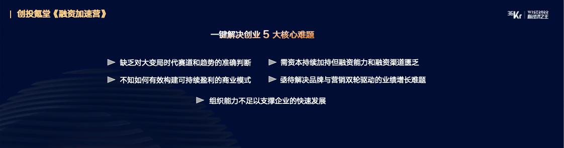 我们第一个核心的拳头产品是融资加速营,可以一站式帮助创业者解决五大难题。因为时间关系我今天先不一一去讲。这个加速营我们现在是已经开展到第二期,那么在今天大会的商学院分会场,我们第一期融资加速营会有一个盛大的DEMO结业,会有面向我们一期二十多位学员的毕业典礼。我们的二期融资加速营将于今年12月盛大开营。感兴趣的学员,或者是您目前的企业苦于融资难,想要获得一些融资路径,或者您想要学习到系统的创投方法论,您可以关注我们的二维码,来咨询我们的融资加速营。