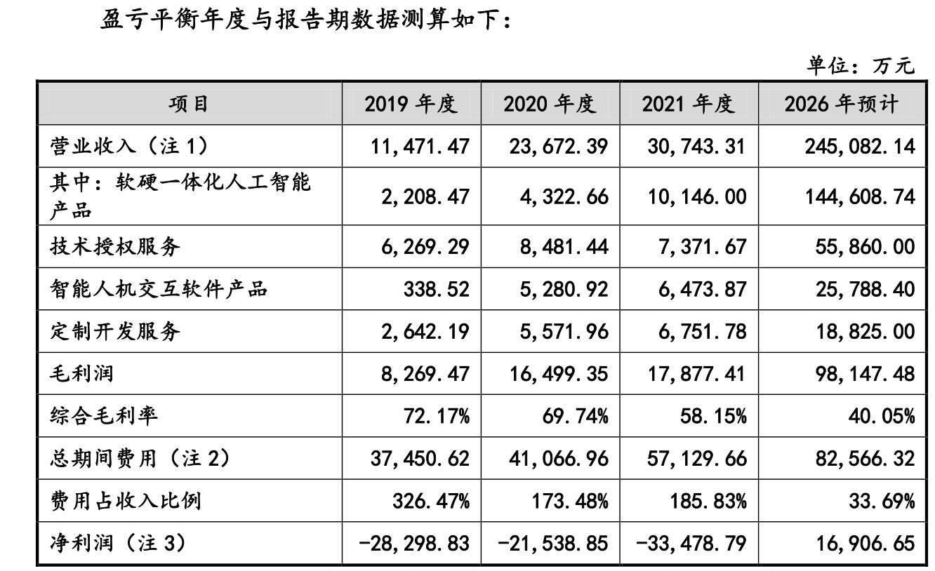 思必驰结合目前经营计划、在手订单情况以及相关条件假设,若进行测算的扭亏为盈的条件均可达成,基于测算扭亏为盈的预期时间点为2026年。具体来看,思必驰预计未来5年营收将保持快速增长态势。根据目前在手订单以及对未来业务的谨慎预测,预计未来2022年—2026年的营收规模分别为4.52亿元、7.25亿元、11.5亿元、16.9亿元和24.51亿元,2021-2026年收入复合增长率为51.46%。
