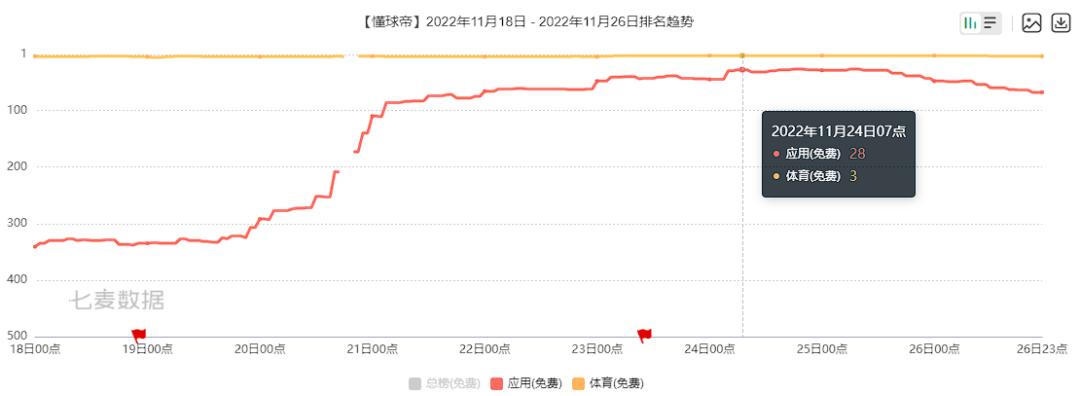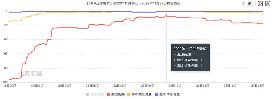 作为2022世界杯官方授权手游,该款App在世界杯开幕前后App Store游戏免费榜排名持续飙升,最高占据游戏榜单Top7: