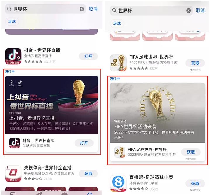除了元数据的改动外,在App Store里搜索“世界杯”我们能看到有一些App同步开启了有关世界杯的App内活动,在相关关键词的搜索结果中显得格外吸睛,如「抖音」「FIFA 足球世界」: