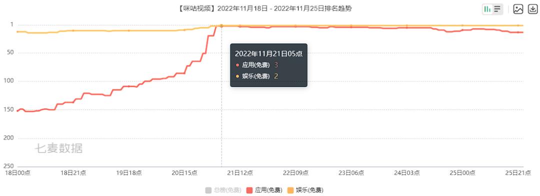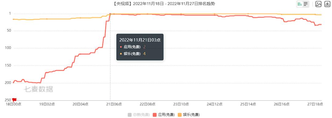 世界杯开幕前后,「央视频」在App Store应用免费榜排名明显呈上升趋势,最高占据榜单Top2: