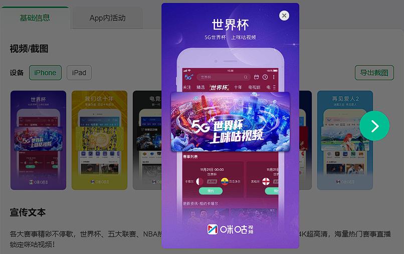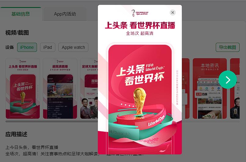 首先在App名称、icon、副标题和截图素材等位置加入“世界杯”相关内容,能直接表明App确有世界杯相关直播、资讯或者活动等,保证用户在进行App Store搜索、查看榜单或者点进App详情页时能捕捉到这些信息,从而根据需求下载和使用App。