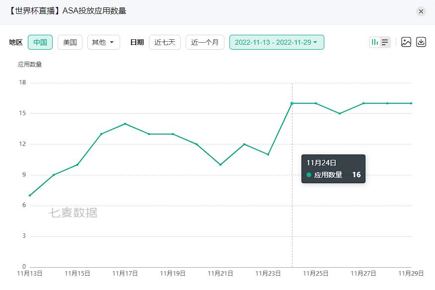 通过七麦数据检索能看到,世界杯开幕后,“世界杯”“世界杯直播”等关键词下的竞价App数也呈逐步上升趋势。