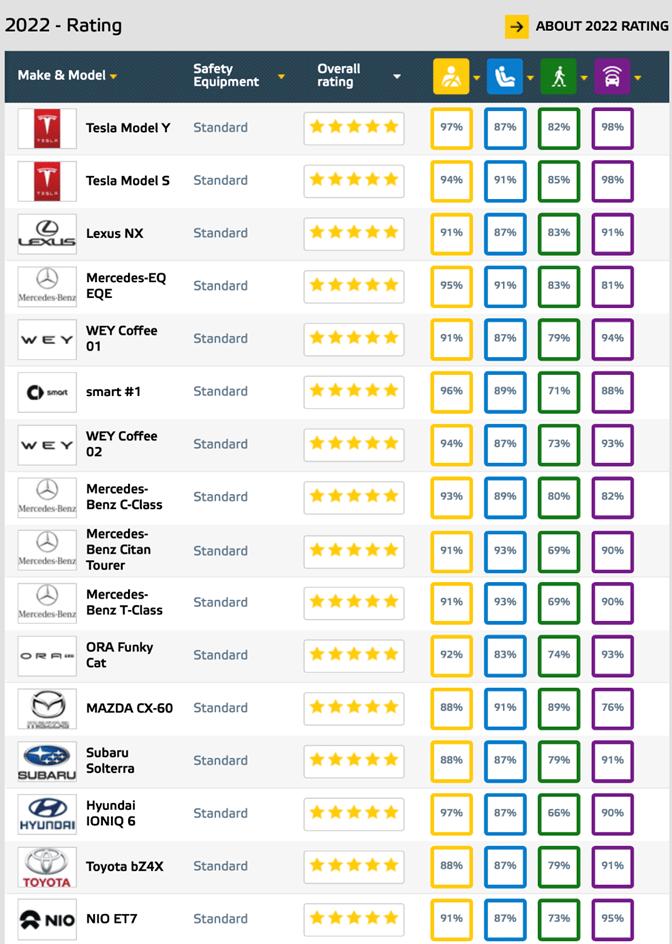 2022年度获得Euro NCAP五星评级的车型 数据来源: Euro NCAP