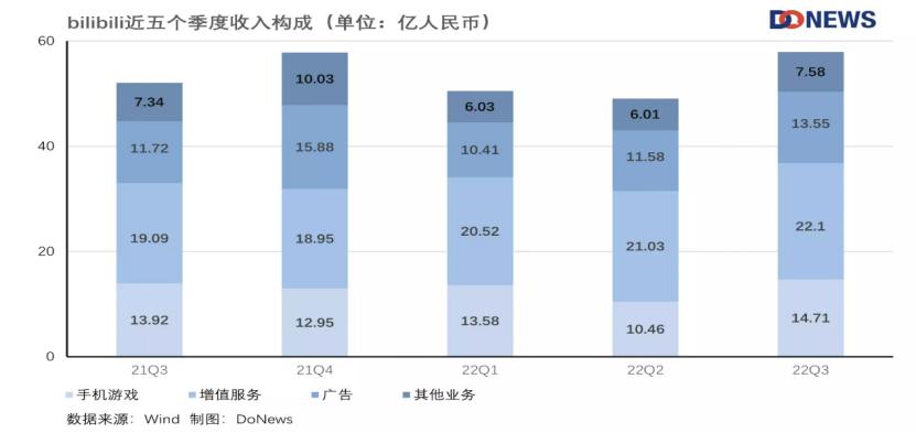 在第三季度财报中可以看出,期内总净收入达到人民币57.9亿元(人民币,下同),比2021年同期增长11%;其中游戏收入为人民币14.7亿元,同比增长只有6%,虽依旧占B站Q3季度营收的25%,但是增长还需进一步提速。