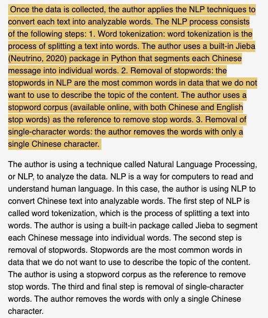 从解释中不难发现 Explainpaper 可以非常准确地理解,并且用简短的话概括摘要。AI 不仅准确定位了研究模型(natural language processing),还用了短短一句话概括了我的研究方法,研究目的和结果也同样准确。