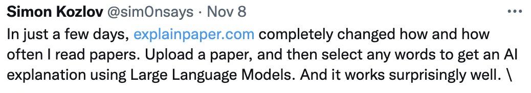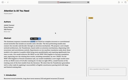 你只要把任何一篇 PDF 格式的论文,传上 explainpaper.com 这个网站,然后划选、高亮任何一个单词、一段话,就能即时看到 AI 的解读、总结。它能用简短的话概括冗长的段落,甚至还能解释论文里的“行话”。如果你还是不理解,还可以逮着它追问……这不就是“哪里不会点哪里”吗?