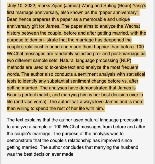 我又试着让它概括文章中的简介(introduction)。在原文中,我写了我与老公相知、相识、相恋到走入婚姻殿堂的过程,引出了我给老公写这篇论文的初衷和此研究的目的。AI 用了不到 5 秒的处理时间,就精准的概括了简介里最主要的两部分: