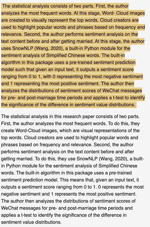 但对于专有名词、引用较多,读起来比较晦涩的段落,AI 就不能很好地概括了,有时候甚至只会复制、粘贴原文内容。比如这一段统计分析 (statistical analysis),它并没有很好概括,只是把这个段落又复述了一遍。潜在原因是这部分出现了很多“生僻词”,AI 没有办法很好辨别出关键内容。