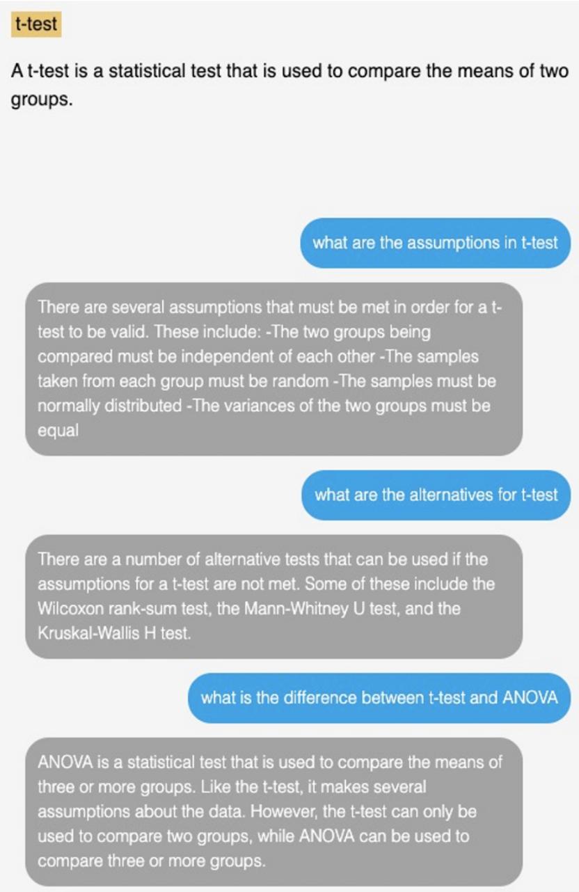 对于 t-检验,我追加了几个专业性很强的问题,比如 t-检验的假设,其他可以替代的统计学检验方式,以及它与 ANOVA 的区别,这个工具都做出了很详细的回答|作者供图
