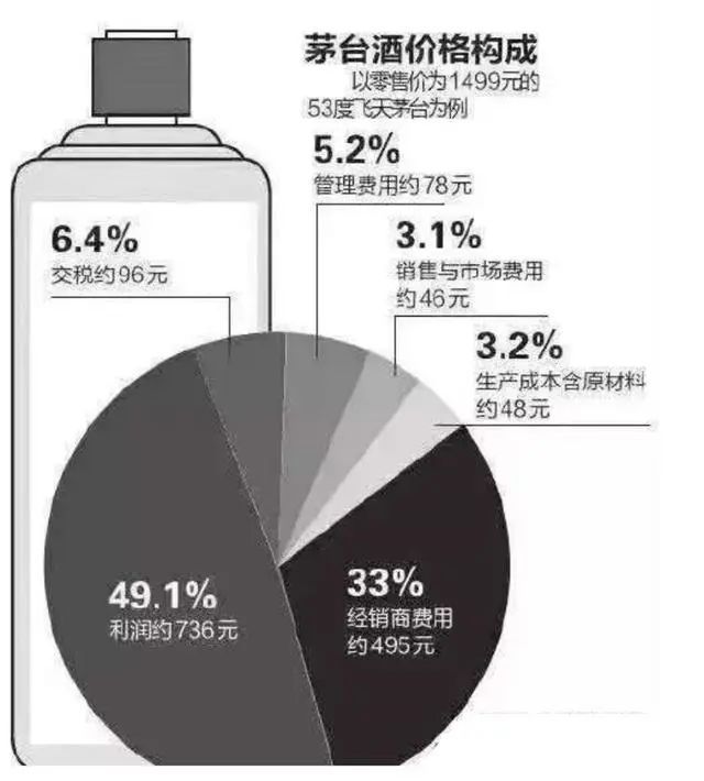 有专业人士曾分析过一瓶零售价为1499元的53度飞天茅台的成本构成:其中生产成本含原料约48元,占比3.2%;销售与市场费用约46元,占比3.1%;管理费用约78元,占比5.2%;经销商费用约495元,占比33%;交税约96元,占比6.4%;利润约736元,占比49.1%。