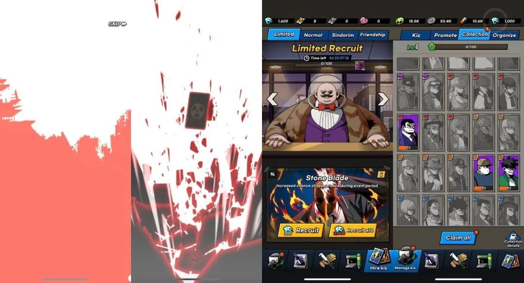 而商业化也必然围绕着资源来展开。每次战斗胜利后,「SEOUL Apocalypse」都能给玩家多种资源,其中用于升级和强化队员的资源可以分为四类。绿色的 Kiz EXP 可以提升队员等级,从而加强队员的生命值上限、解锁装备栏;银色的 Sindorim Coin 可以用来购买装备;红蓝色药丸 Kiz Supplements 主要用来升级队员的必杀技能;而最后的钻石(Diamonds)既可以购买高级装备,还能在人力资源部抽卡。