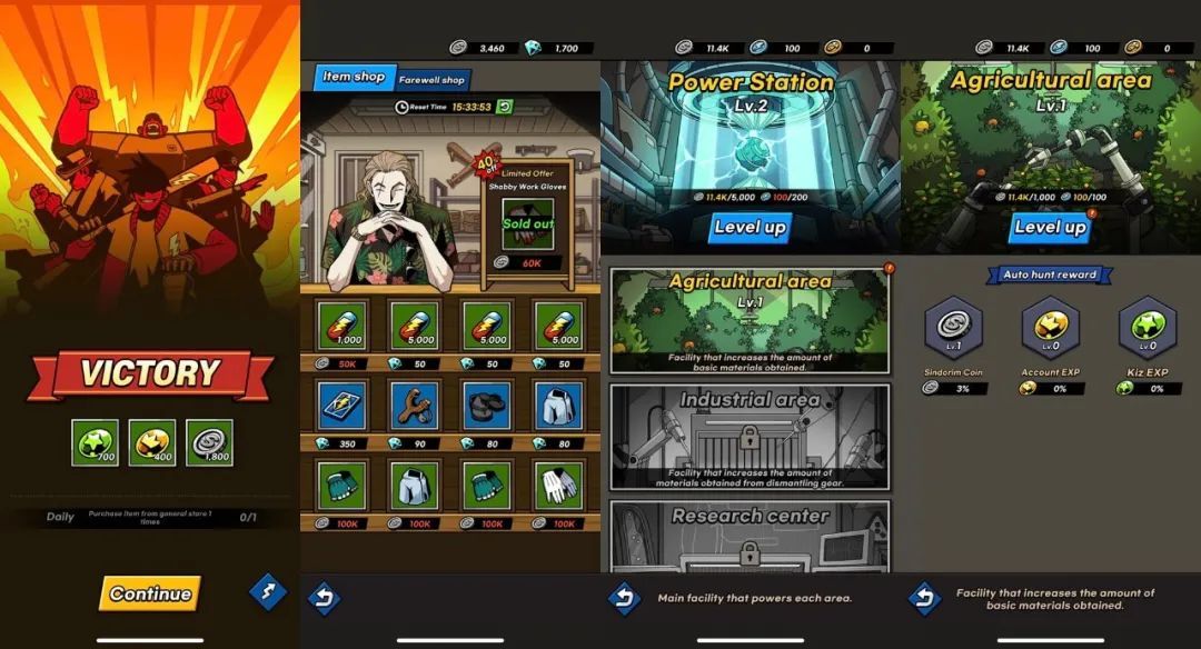 游戏在升级队员的时候一般都会同时消耗多项资源,不过从笔者在前三章一共 60 多场战斗的体验上看,资源本身并不容易出现短缺。「SEOUL Apocalypse」也会和其他同类产品一样提供各种每日、每周以及每月挑战,奖励大多都是 Sindorim Coin,除了让游戏体验更加“顺利”以外,游戏还拥有一定的轻度模拟经营“副玩法”,玩家在前期进程结束后可以开启一个“生产区”,挂机自动生成许多基础资源。