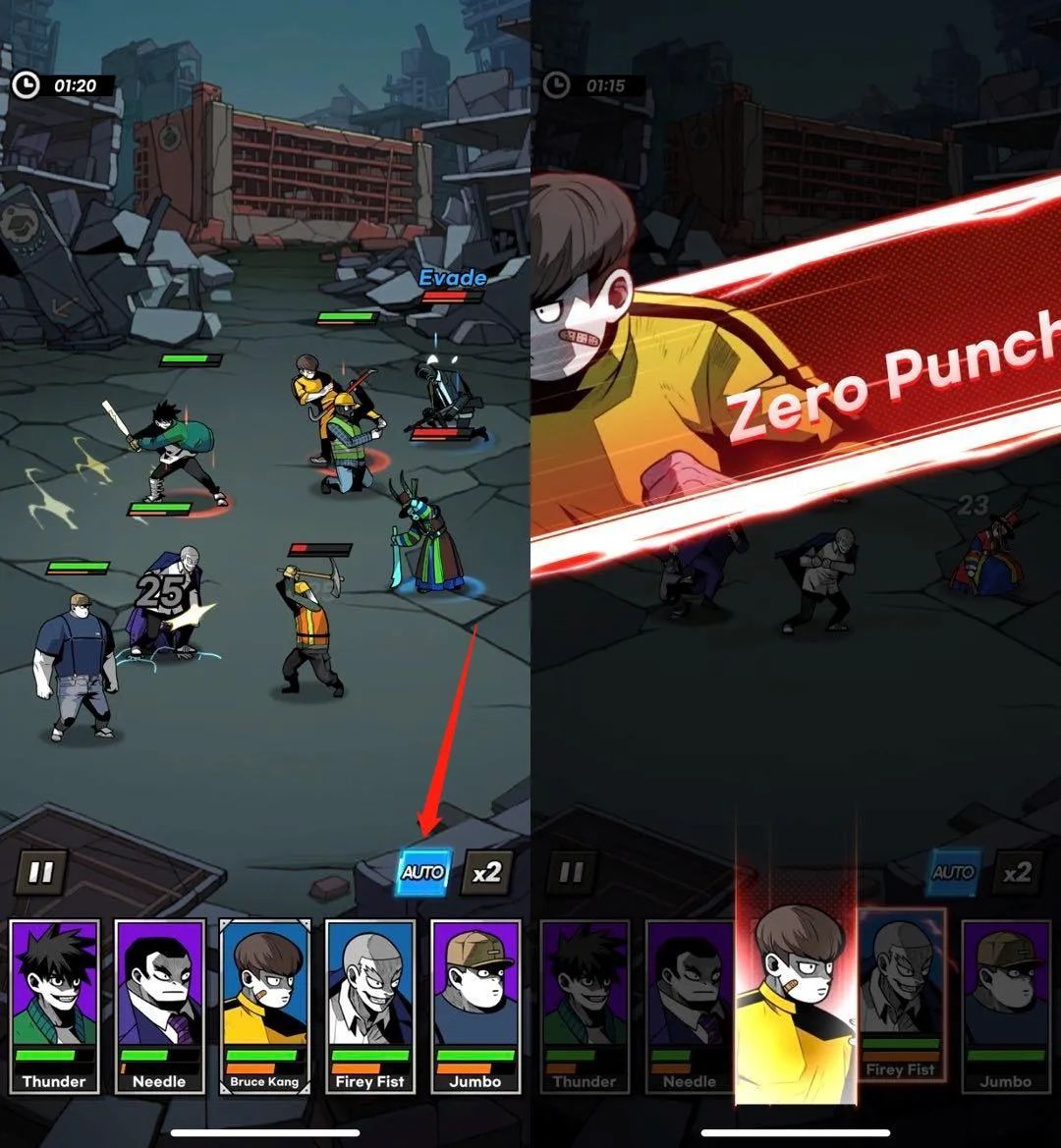 即便是放出必杀技,也能通过点击屏幕右下方的“Auto”按键(红箭头所指)实现全自动化操作 | 图片来源:Super Awesome