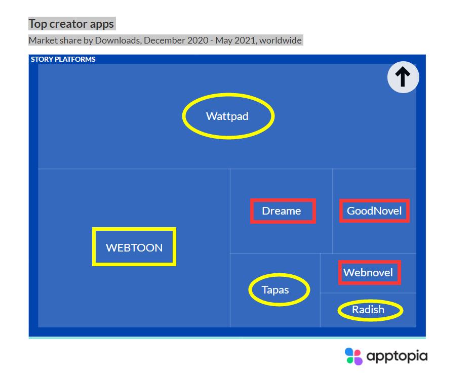 此前,只有 Webtoon 一家平台来自韩国厂商。两家公司扫购之后,黄色圈出的平台全部被纳入韩国厂商旗下,也就是说 Naver 在自己占优的漫画赛道之外,补足了网文的短板。