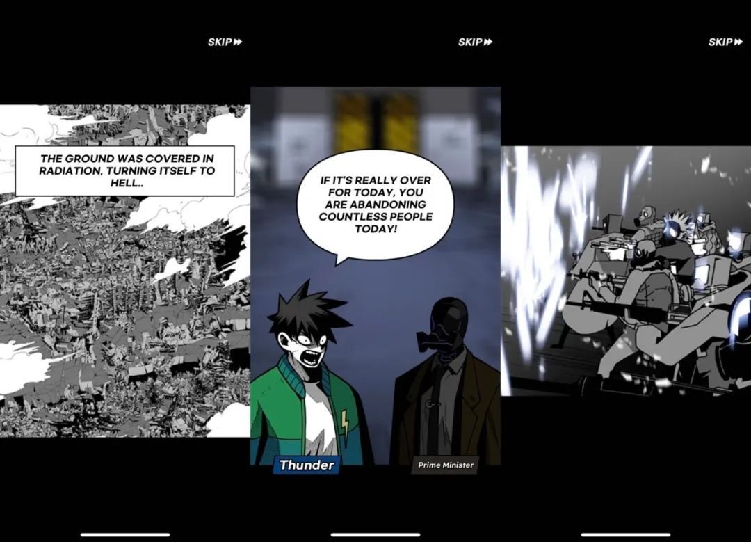此外为了呼应原作《地下城市》,「SEOUL Apocalypse」也把漫画原作融入到了主线任务里。游戏的故事章节目前已更新至 22 个,每 8-10 场战斗就能完成一个故事章节,故事情节采用定格动画展现,一般会在每一章的开头和末尾集中展现。但是就笔者的体验来讲,这些定格动画的表现方式还是比较常规和死板,虽然情节上借助原作优势能够做到内容上的吸引力,但剧情的展示方式很普通,只是一格一格地自动播放原作漫画,并没有进一步融入到玩家操作上,卖点不太突出,互动性偏差。