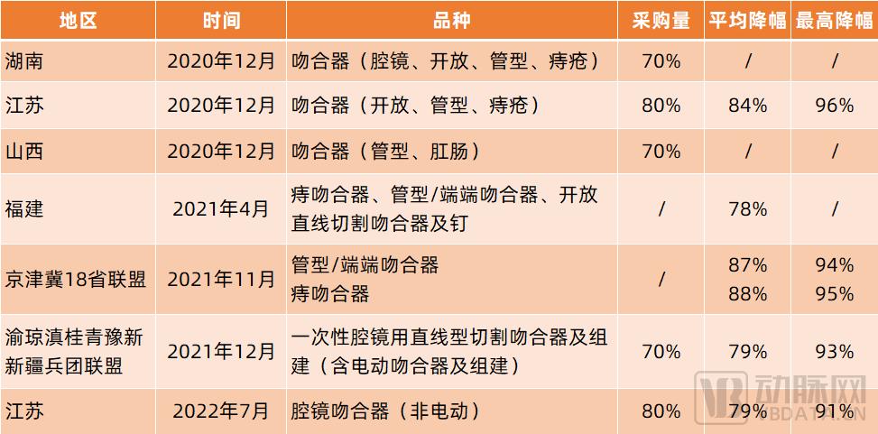 近两年,吻合器已成为集采最频繁、最广泛的产品之一,各省/市/自治区或单独或形成联盟陆续开展吻合器集中带量采购。