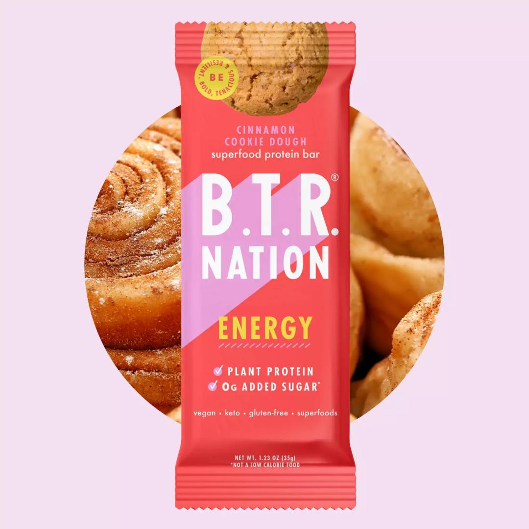 北美食品品牌B.T.R. NATION就推出了一款肉桂风味曲奇饼能量棒——BTR Cinnamon Cookie Dough Plant Protein Energy Bar。该产品每份含有8g蛋白质和5g碳水化合物,没有添加糖分。其中含有的玛咖、虫草和肉桂成分,可以很好地帮助补充能量。