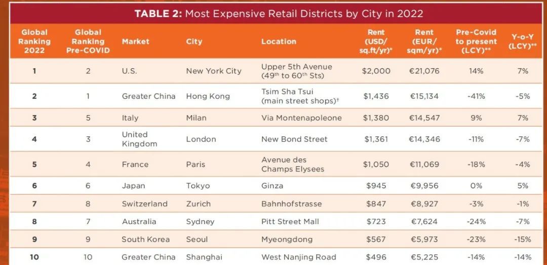 从租金排名来看,纽约上第五大道成为全球租金最高的街区,平均租金为2000美元/平方英尺(约为人民币14万元/平方米),较疫情前增长14%。