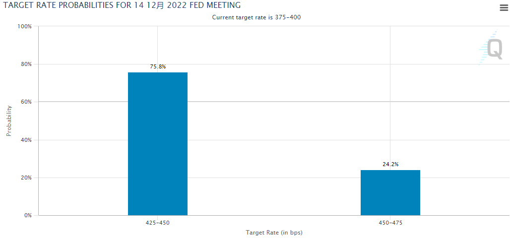 因此我们也能看到,在昨夜鲍威尔讲话之后,利率市场对美联储12月加息50个基点的概率预测,重新升至了75%以上。