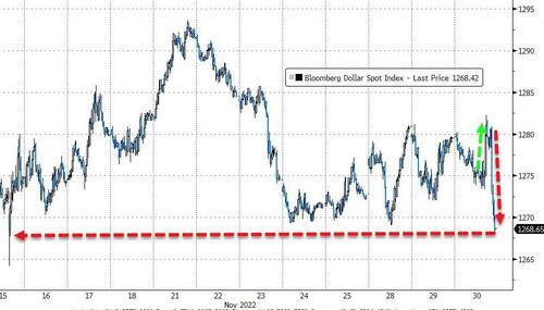 隔夜与美债收益率一同走软的还有美元指数。当天意外大幅低于预期的美国ADP就业数据,和随后被市场解读为鸽派的鲍威尔讲话,令ICE美元指数一路跌落106关口,刷新日低至105.80下方,全天跌近1%。彭博美元指数在11月创下了自2009年5月以来最为糟糕的月度表现。