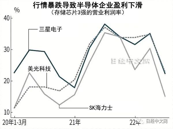 与此同时,目前的存储器行情也成为逆风。三大半导体存储芯片制造商的业绩7~9月大幅下滑。其中,SK的营业利润率从4~6月的30%降至15%。降幅高于三星电子和美国美光科技。