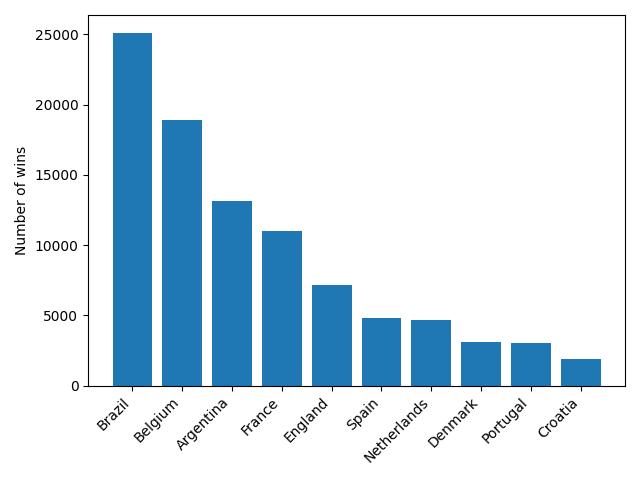 毫不意外,巴西队一如既往成为第一大热门,在25,000次预测中都登顶了本届世界杯,夺冠率高达25%。
