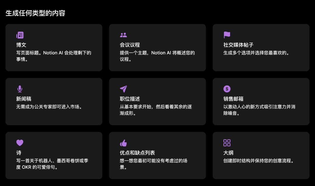 - 2022 年 11 月 16 日晚,Notion 发布了 Notion AI 写作助手,它可以被用来生成多个文本内容并用于不同的场景,帮助用户完成写作、初稿整理以及记录创意点子等流程:
