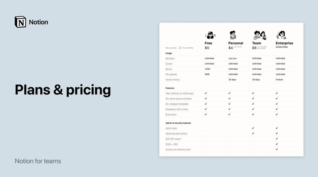 目前,Notion 的定价分为四个组合,即个人免费、个人专业、团队和企业,对于大部分个人用户而言,早期 Notion 提供的免费版已经足够用了,如果有在协作以及数量/容量上的需求,则需要升级成为付费用户,而团队/企业版本则拥有更多的协作和操作权限,个人用户到团体用户可以自助完成整个销售动作。