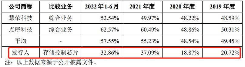 2019年-2022年H1,得一微营业收入分别为1.26亿元、2.07亿元、7.45亿元和4.71亿元,近三年复合增长率为143.28%,其中2021年相较2020年收入翻了三倍还多。在行业层面,得一微抓住了2021年半导体行业景气度提升的机遇,收入爆增。在业务层面,产品竞争力和品牌影响力越来越强,其主营产品在2020年和2021年迅速起量,扩大了市场份额。根据艾瑞数据,得一微的存储控制芯片在全球市占率达4%。