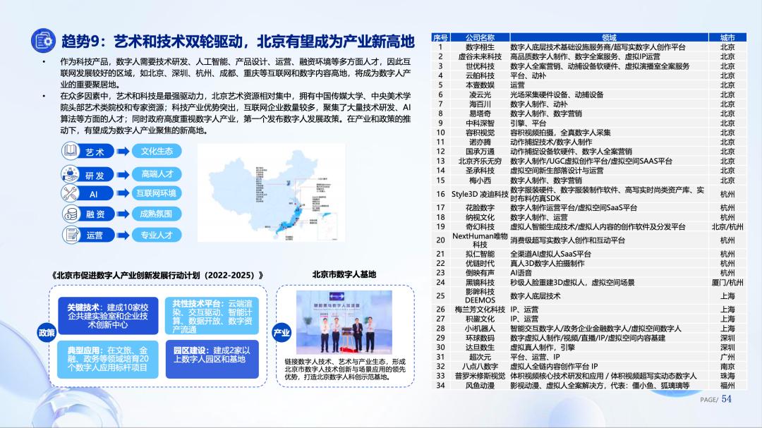 作为科技产品,数字人需要技术研发、人工智能、产品设计、运营、融资环境等多方面人才,因此互联网发展较好的区域,如北京、杭州、上海、深圳等互联网和数字内容高地,将成为数字人产业的重要聚居地。在众多因素中,艺术和科技是最强驱动力,北京艺术资源相对集中,拥有中国传媒大学、中央美术学院头部艺术类院校和专家资源;科技产业优势突出,互联网企业数量较多,聚集了大量技术研发、AI算法等方面的人才;同时政府高度重视数字人产业,第一个发布数字人发展政策。在产业和政策的推动下,有望成为数字人产业聚焦的新高地。