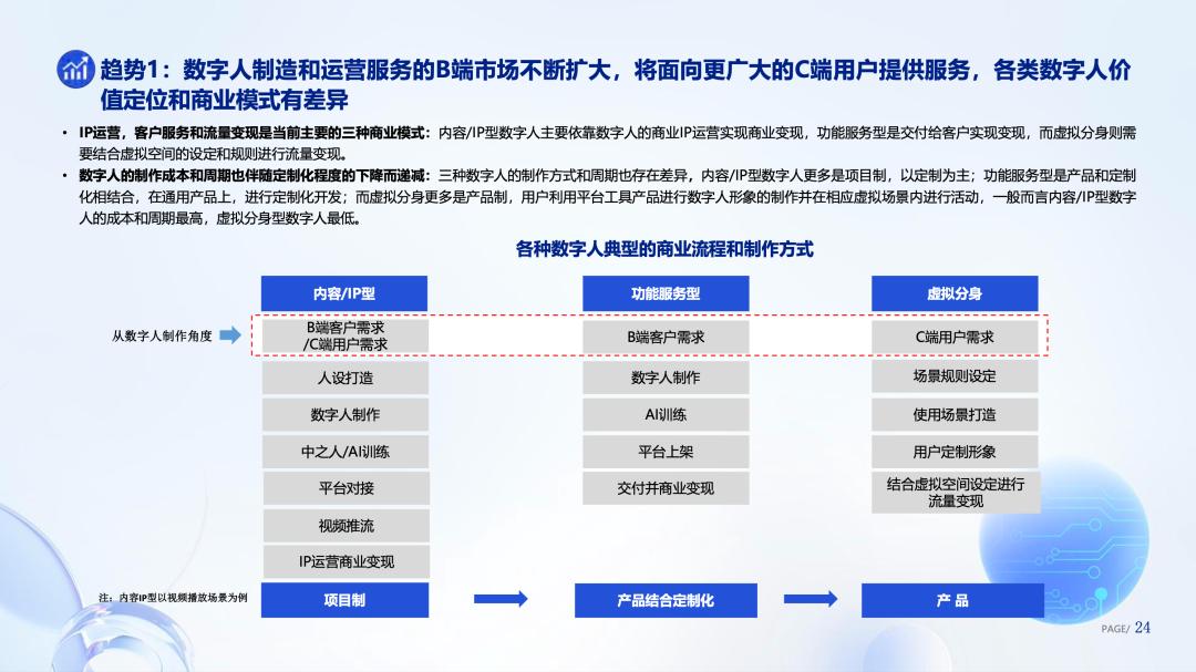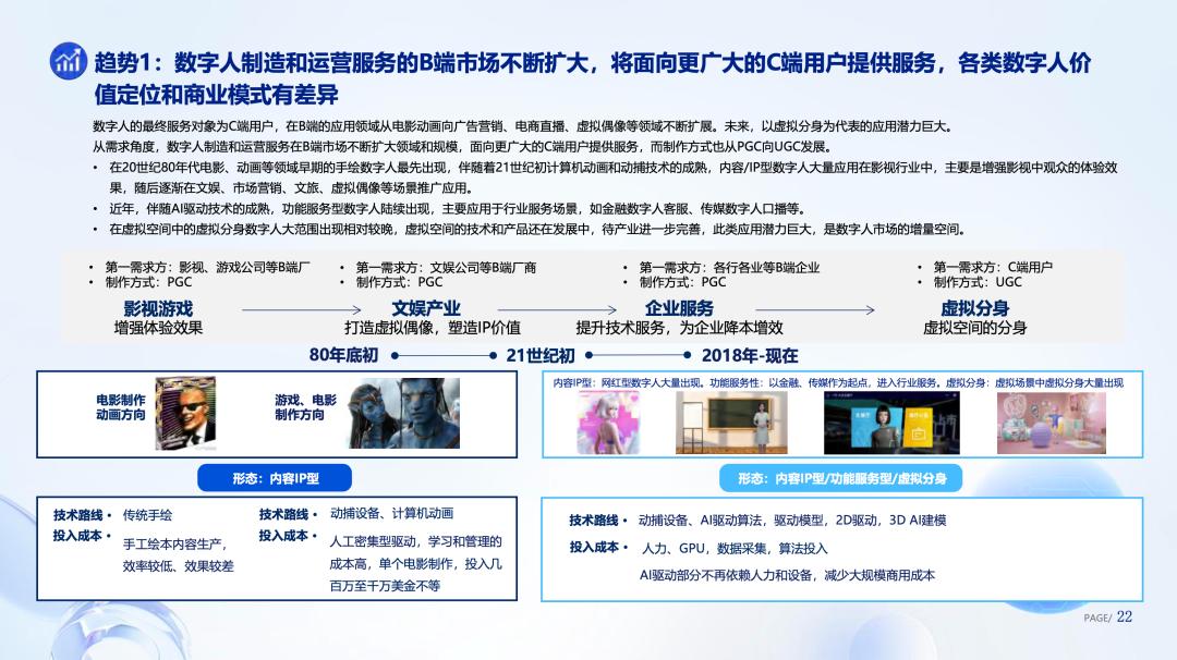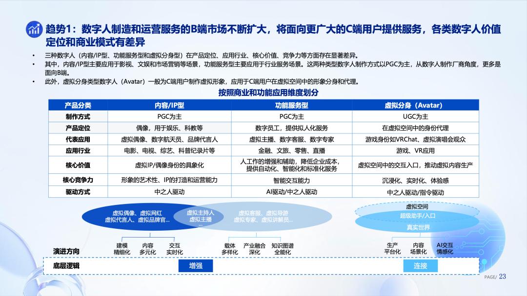 趋势1:数字人制造和运营服务的B端市场不断扩大,将面向更广大的C端用户提供服务,各类数字人价值定位和商业模式有差异。