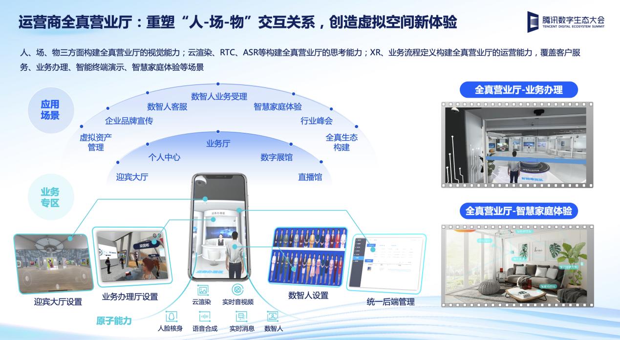 腾讯与运营商的合作已有多个典型合作案例。比如,基于腾讯的XR、云渲染等技术,腾讯云能够帮助运营商建立一个虚拟空间内的“全真营业厅”,同时还有“数字人”帮助运营商进行实时运营,可以满足客户服务、业务办理、智能终端展示等场景需求,提升人力投入效率。