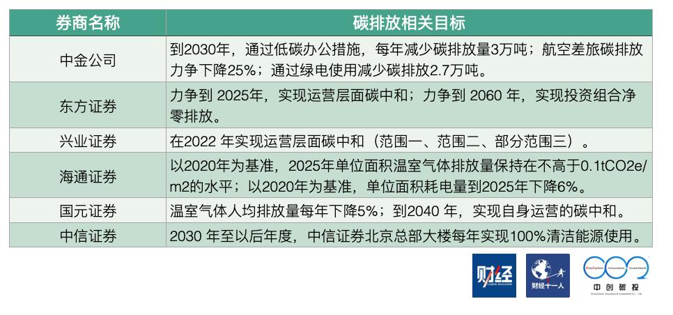 在“碳排放绩效与目标”议题中,证券公司的表现与银行类似,均存在核算水平层次不齐的情况。各券商披露的自身运营碳排放量在几千吨至几万吨不等。其中,6家公司披露碳排放或与之相关的目标 (见表3) 。