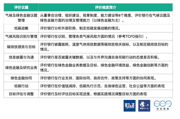 商业银行评价体系包含9项议题,37个细分维度;证券公司评价体系包含9项议题,36个细分维度,力求全方位、多角度评价金融公司的双碳表现 (详见附注) 。两个评价体系参考了国际认可度较高的TCFD (气候相关财务披露工作小组) 披露指引、中创碳投“SMART-ABC”企业碳管理框架,以及国内外金融机构信息披露指引。