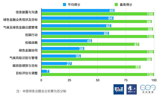 商业银行在“气候及绿色金融议题管理”议题的得分相对较高 (见图1) ,无论是顶层设计还是配套支持,都比较完善,这为发展绿色金融、应对气候变化均提供了有力保障。
