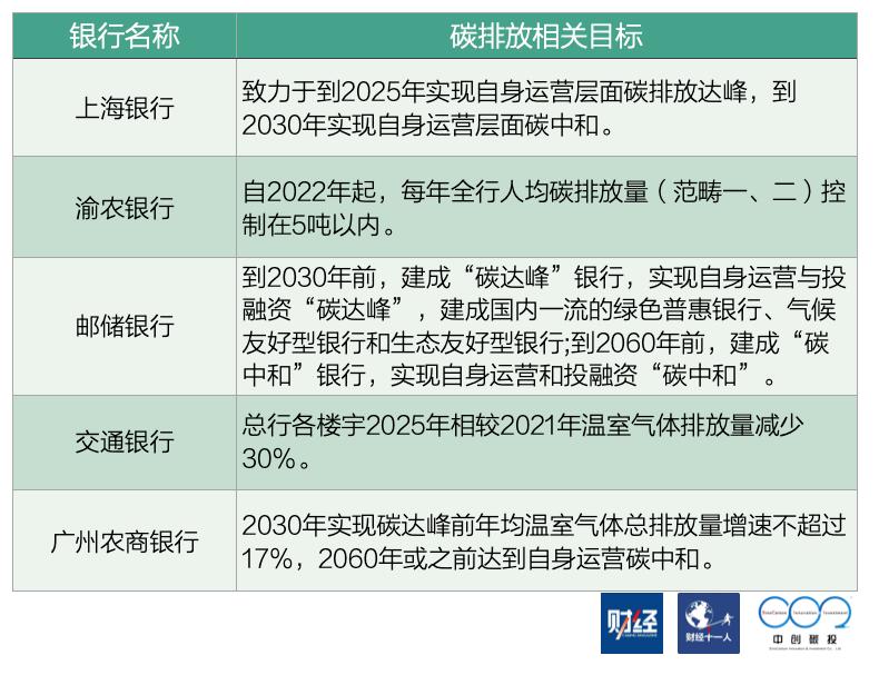 制定碳排放目标,是企业切实减碳的第一步,然而,仅五家银行披露碳排放相关的目标 (见表2) 。