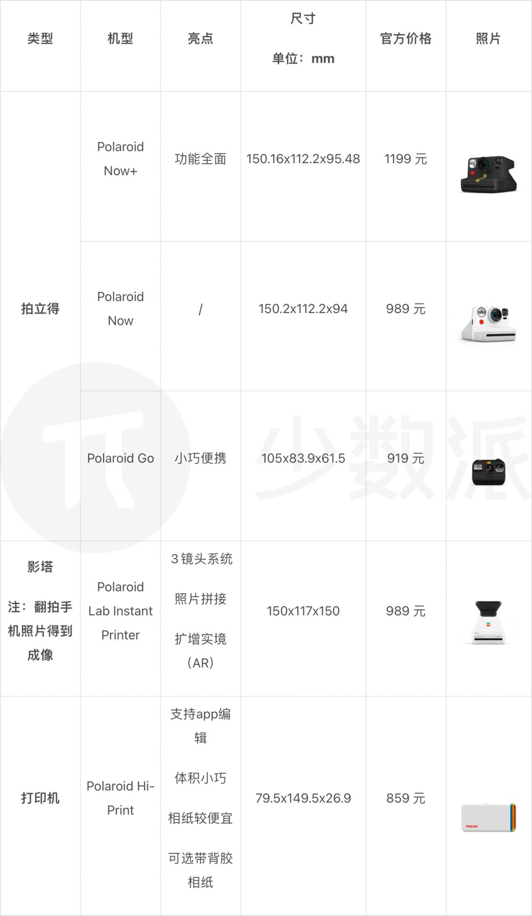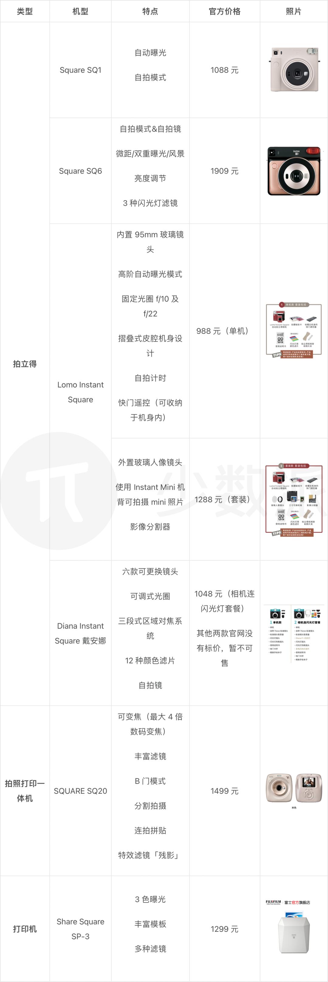 正方形的选择相比宽幅稍多一些,甚至有 SQUARE SQ20 这类拍照打印一体并且可变焦的机型: